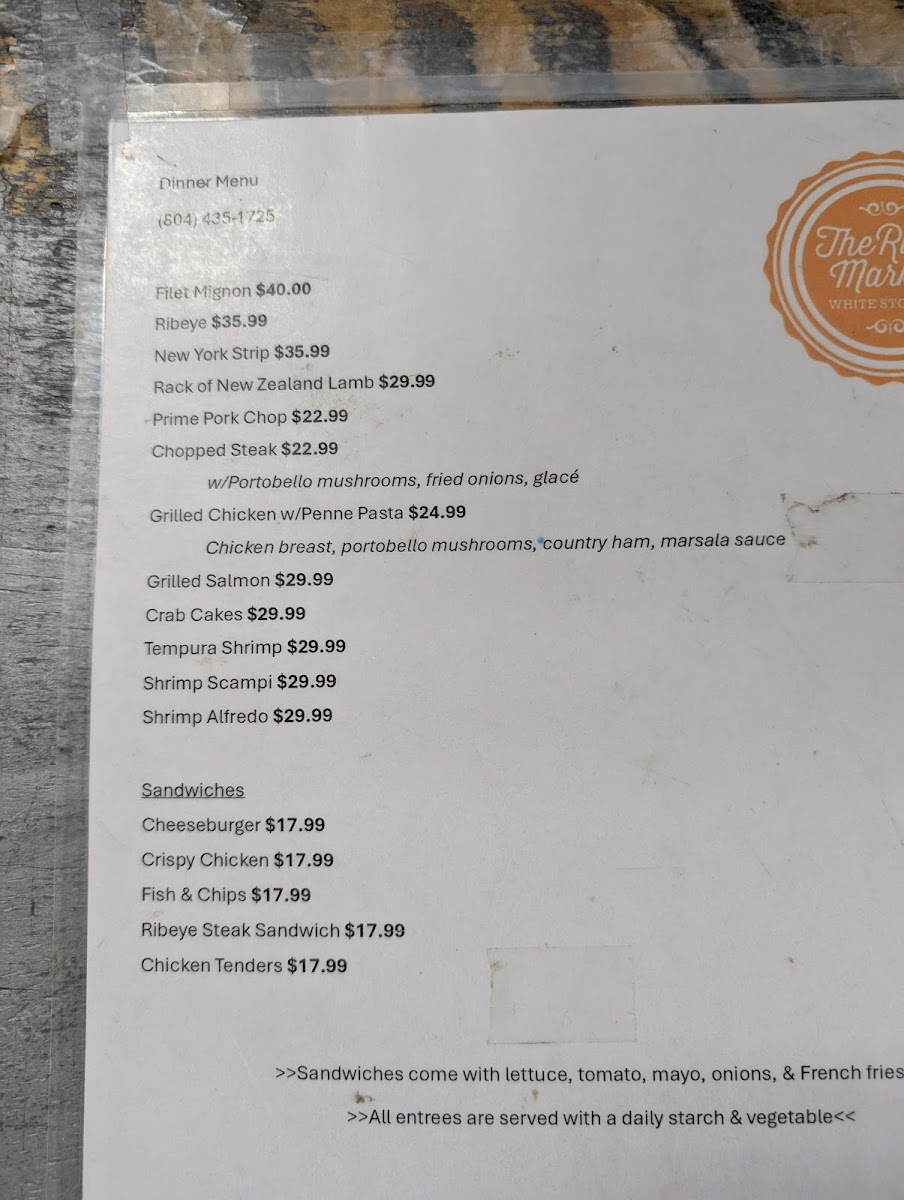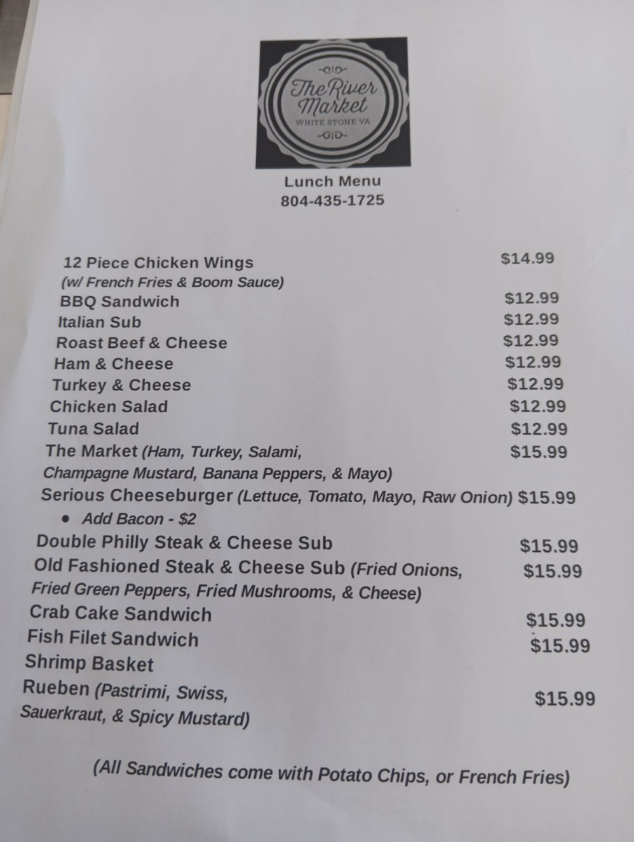 Located in the charming White Stone, Virginia, River Market is a culinary gem that offers a delightful array of dishes sure to please any palate. The menu boasts a variety of succulent sandwiches like the classic cheeseburger and crispy chicken, each priced at a value-friendly US$17.99. For those seeking heartier options, the steaks take center stage, featuring premium cuts like Filet Mignon and Ribeye, with prices ranging from US$22.99 to US$40.00.